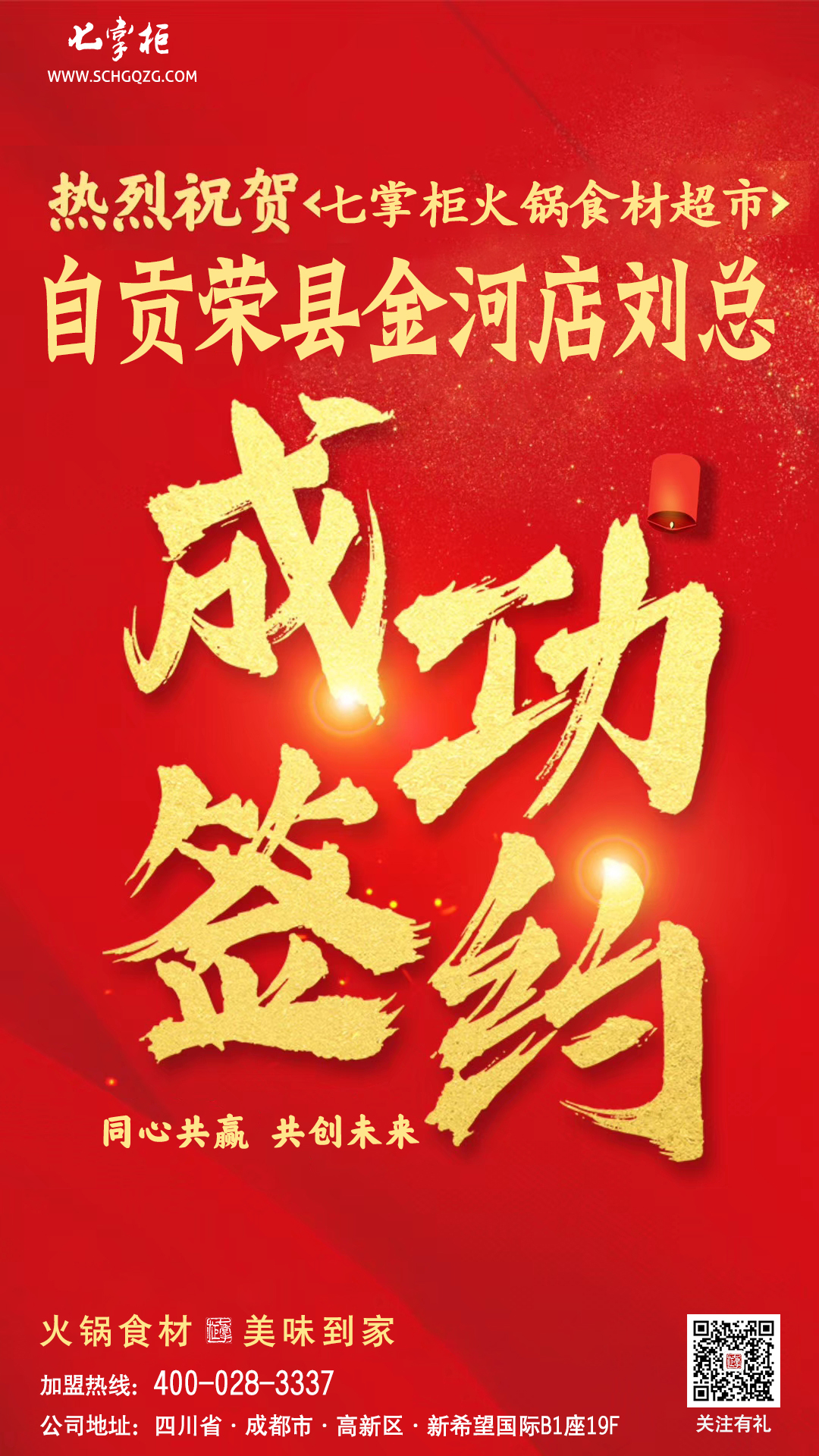 热烈祝贺七掌柜火锅食材超市自贡荣县店2020年7月29日签约成功