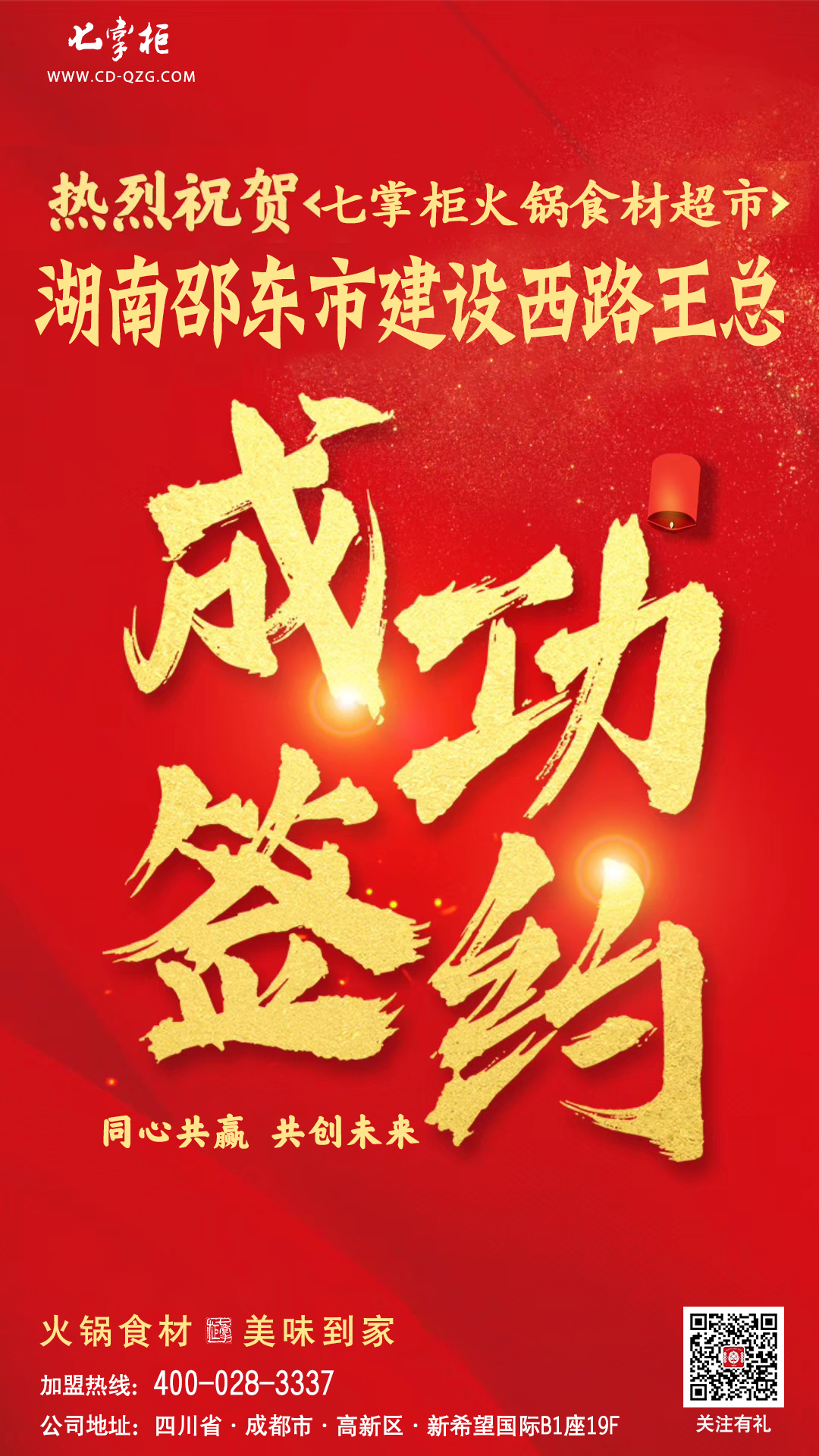 热烈祝贺七掌柜火锅食材超市邵东建设西路店2020年9月26日签约成功